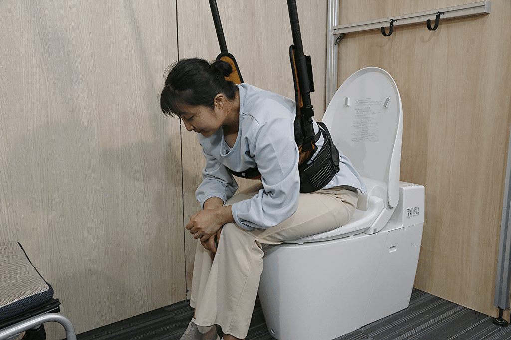 4.カーボンパイプを押し込みながら下降させ、ご利用者が便座に着座します。見守りなく一人で排泄が可能です。