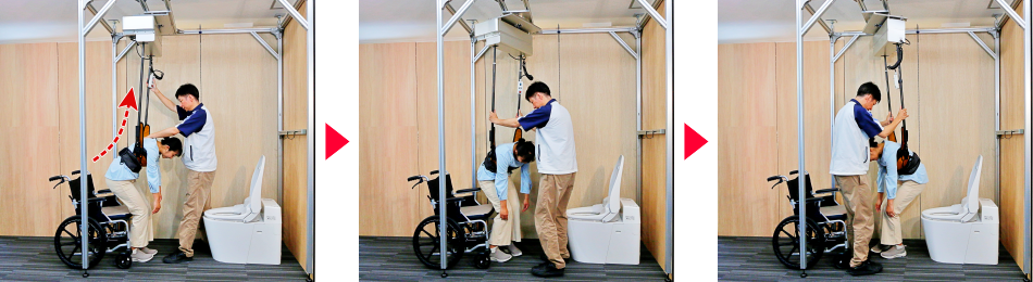 3.操作スイッチでご利用者をリフトし、ご利用者自身の足を使っていただきながら、機材を便座方向にゆっくり旋回しながら移乗します。
